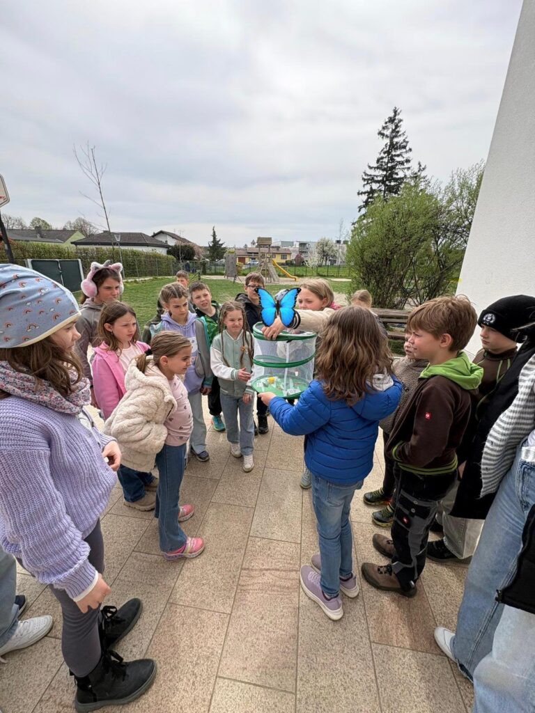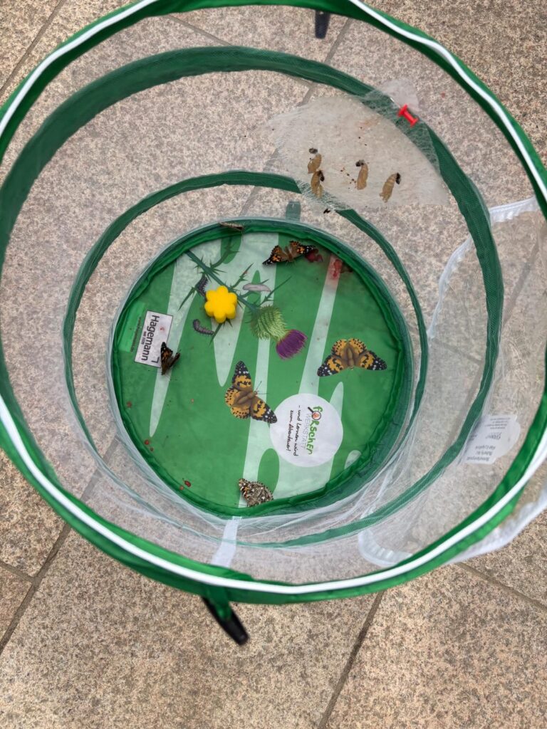 Die beiden dritten Klassen zogen Distelfalter auf und konnten dabei den gesamten Lebenszyklus, von der Raupe bis zum fertigen Schmetterling, beobachten. Zum Abschluss wurden die Schmetterlinge gemeinsam in die Freiheit entlassen.